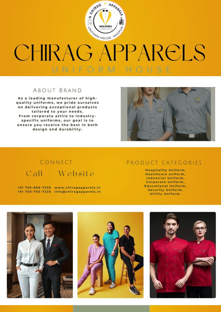 Chirag Apparels is a leading provider of high-quality customized uniforms for a wide range of industries, including hospitality, healthcare, corporate, industrial, security, salon & spa, and education. Based in Nagpur, we offer pan-India services, delivering exceptional craftsmanship and tailored solutions to meet the unique needs of our clients.
